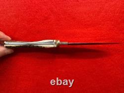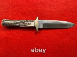 REMARQUE - aucune tentative n'a été faite pour polir, nettoyer ou rendre ce couteau plus attrayant pour les photos. Un très bon couteau de chasse ou de combat avec manche en corne par Joseph Rodgers, avec le vieux tampon de lame "No.6 Norfolk Street" et "Cutlers to their Majesties - ce qui me fait croire que cela date du début des années 1900 après la mort de la reine Victoria et le couronnement du roi Édouard VII et de la reine Alexandra - donc entre 1901 et 1911. Mesure environ 9 1/4 pouces de long, de la pointe à l'extrémité du pommeau. Profil de lame intéressé en biseau, mesurant environ 4 ¾ pouces de long, de la pointe au début de la garde transversale. La face avant de la lame est estampillée Joseph Rodgers Cutlers to their Majesties No. Poignées en corne coniques fixées par 4 rivets.