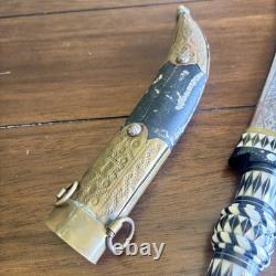 Le couteau khanjar syrien antique vintage est une arme traditionnelle et historique connue sous le nom de poignard jambiya. Cette pièce unique et authentique est un symbole de savoir-faire et d'artisanat syrien. Le couteau est accompagné d'un fourreau, mettant en valeur le design complexe et la signification culturelle de cette arme ancienne. Parfait pour les collectionneurs ou ceux qui s'intéressent aux couteaux historiques, ce couteau khanjar incarne la beauté et le patrimoine du design syrien.
