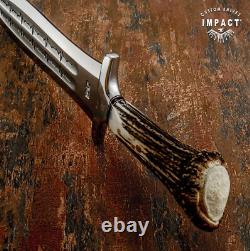 La superbe poignée en bois de cerf offre une excellente prise en main. Le couteau est complété par une garde en acier inoxydable forgé à la main.